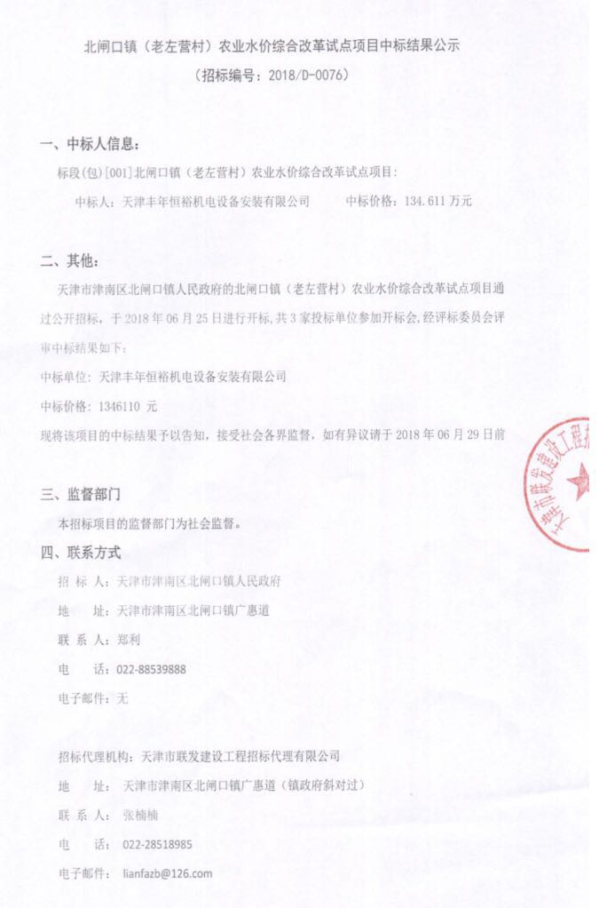 津南区北闸口镇(老左营村)农业水价综合改革试点项目中标公告