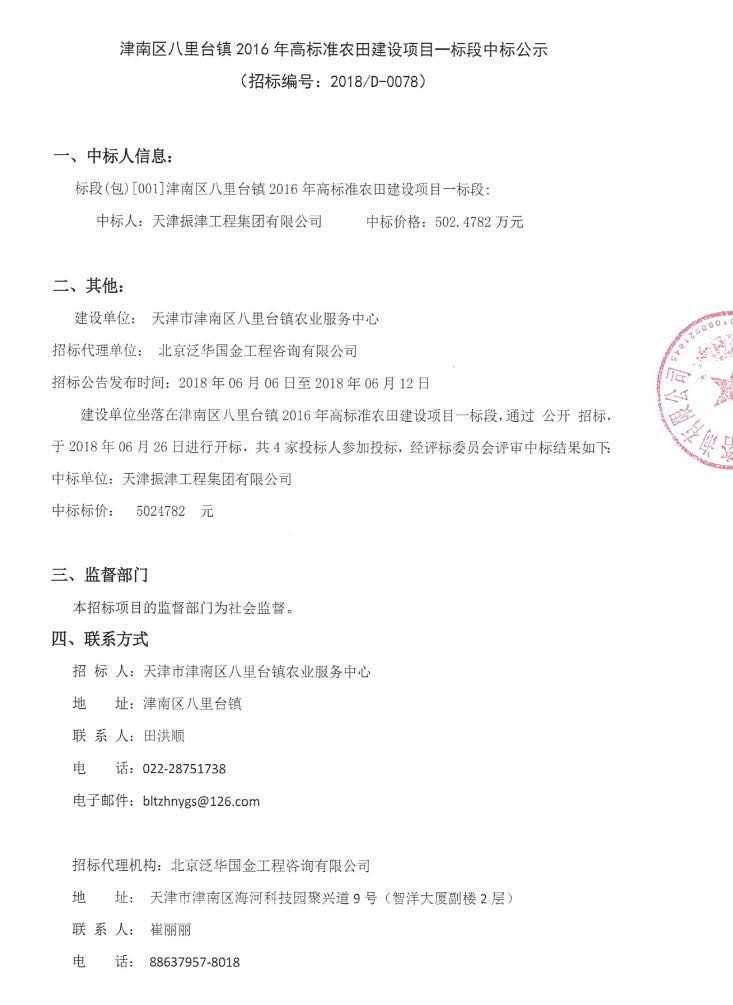 津南区八里台镇2016年高标准农田建设项目一标段中标公告