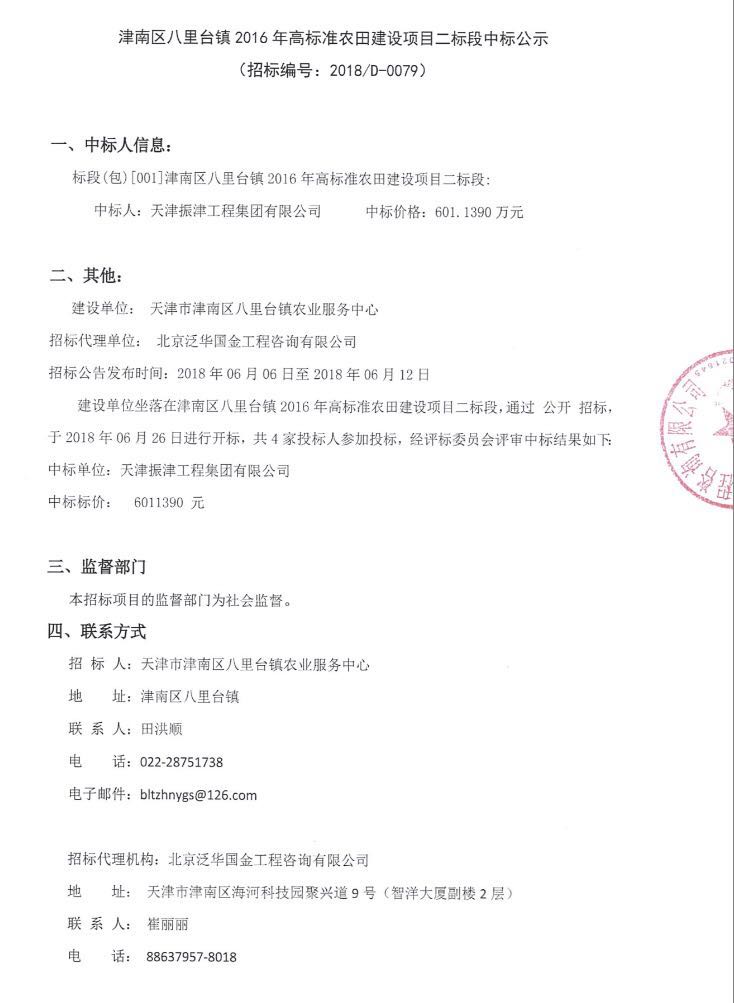 津南区八里台镇2016年高标准农田建设项目二标段中标公告