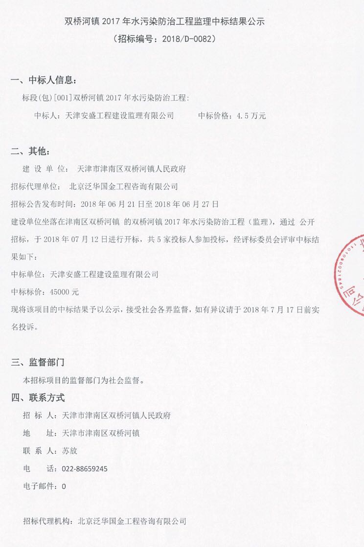 双桥河镇2017年水污染防治工程监理中标结果公示