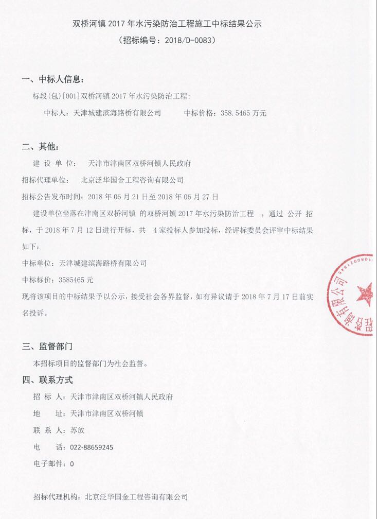 津南区双桥河镇2017年水污染防治工程施工中标结果公示