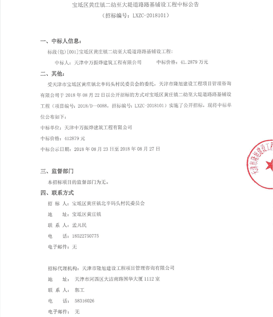 宝坻区黄庄镇二幼至大堤道路路基铺设工程中标公告