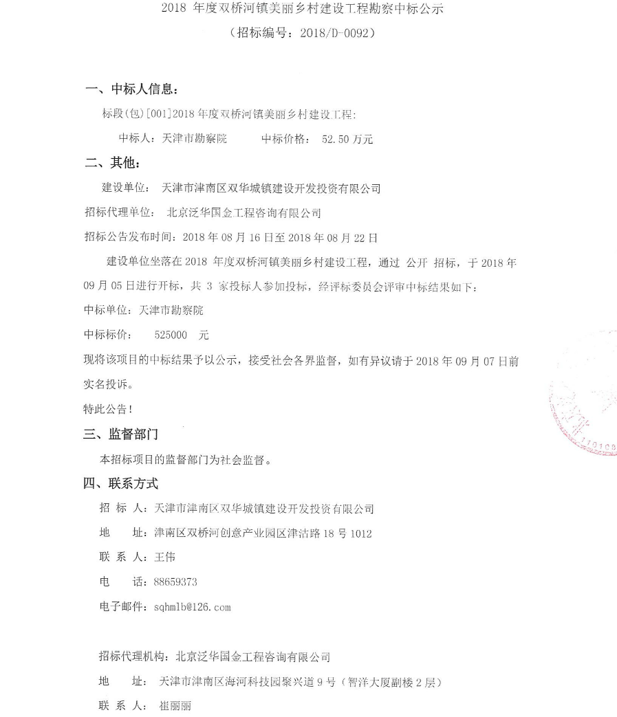 2018 年度双桥河镇美丽乡村建设工程勘察中标公示