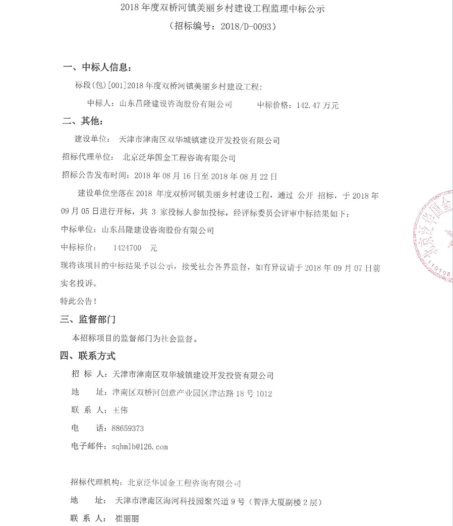 2018年度双桥河镇美丽乡村建设工程监理中标公示