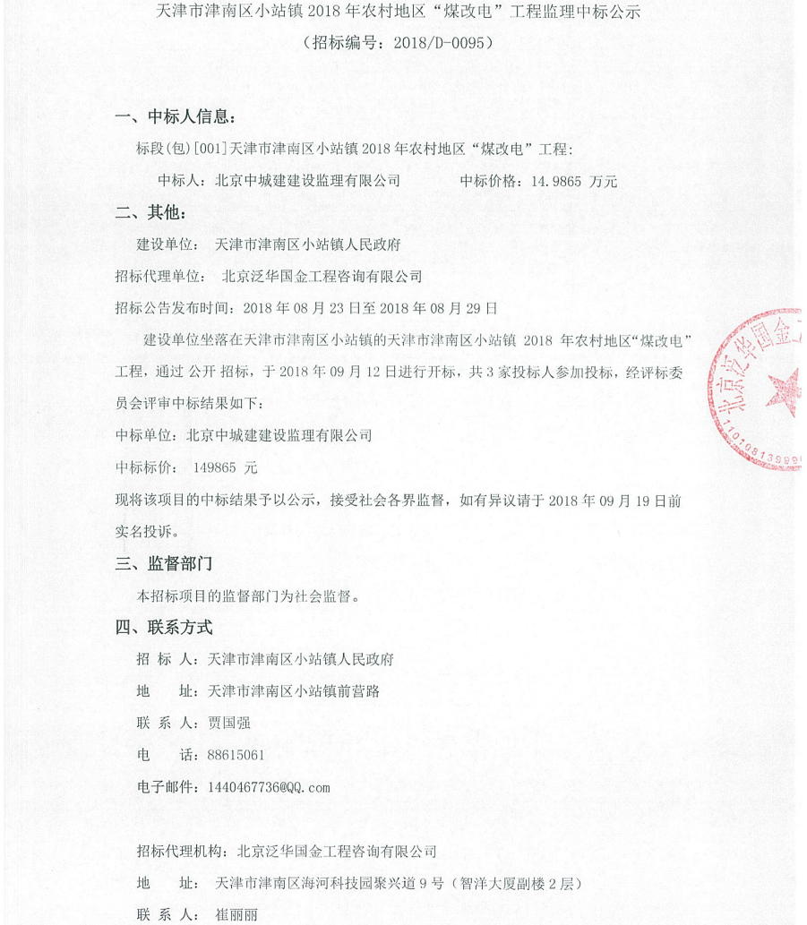 天津市津南区小站镇2018年农村地区“煤改电”工程监理中标公示