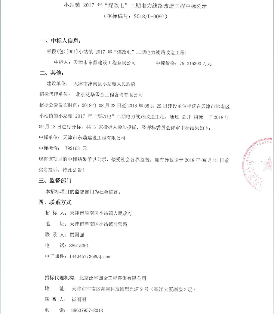 小站镇2017年“煤改电”二期电力线路改造工程中标公示