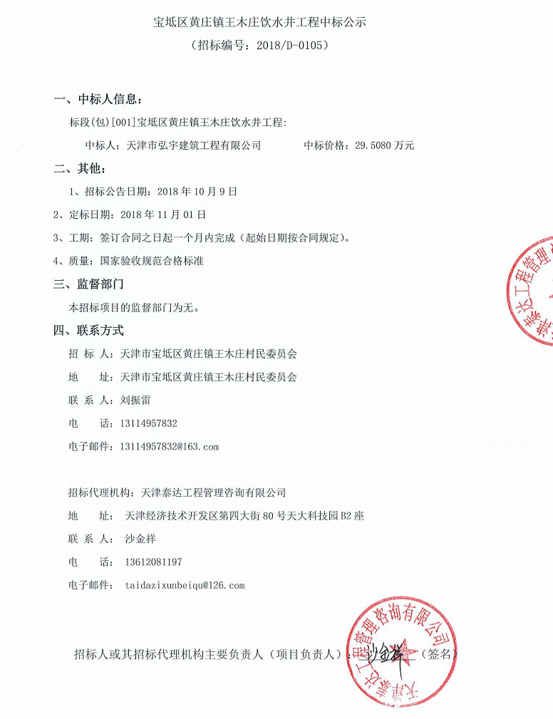 宝坻区黄庄镇王木庄饮水井工程中标公示