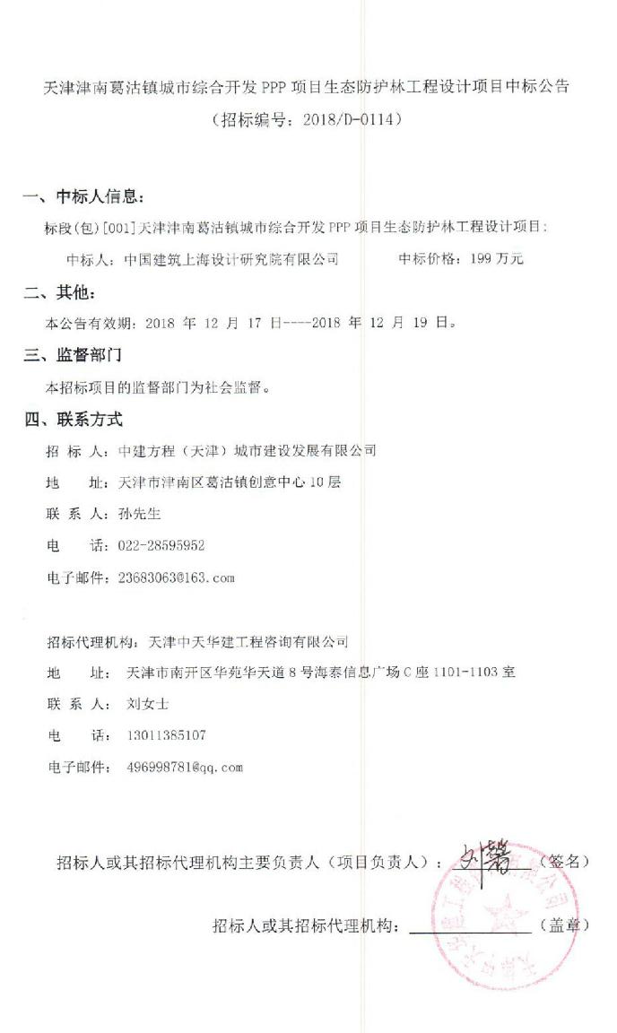 天津津南葛沽镇城市综合开发PPP项目生态防护林工程设计项目中标公告