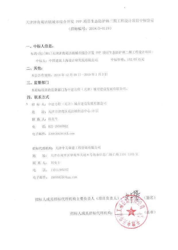 天津津南葛沽镇城市综合开发 PPP 项目生态防护林二期工程设计项目中标公示