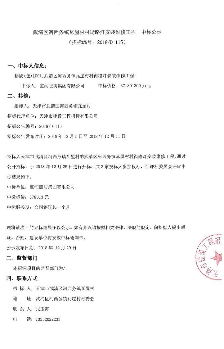 武清区河西务镇瓦屋村村街路灯安装维修工程中标公示