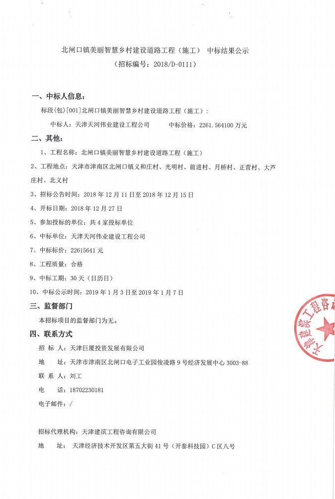 北闸口镇美丽智慧乡村建设道路工程(施工) 中标结果公示