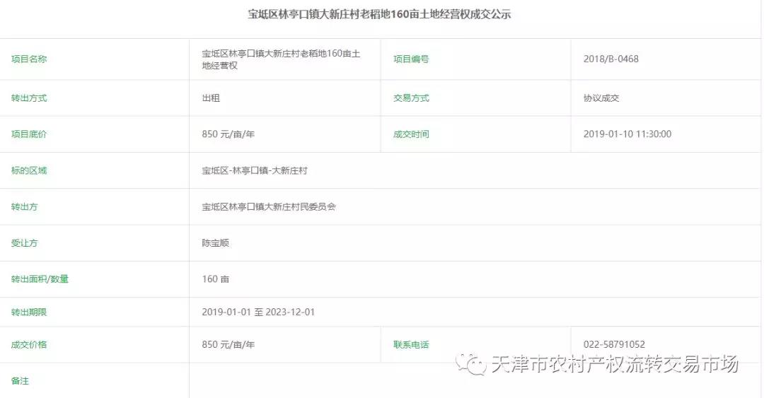 1月10日上午,宝坻区林亭口镇大新庄村老稻地160亩土地经营权在天津农交所顺利成交。该项目转出方为宝坻区林亭口镇大新庄村村民委员会,受让方为新型农业经营主体,成交价格为850元/亩/年。