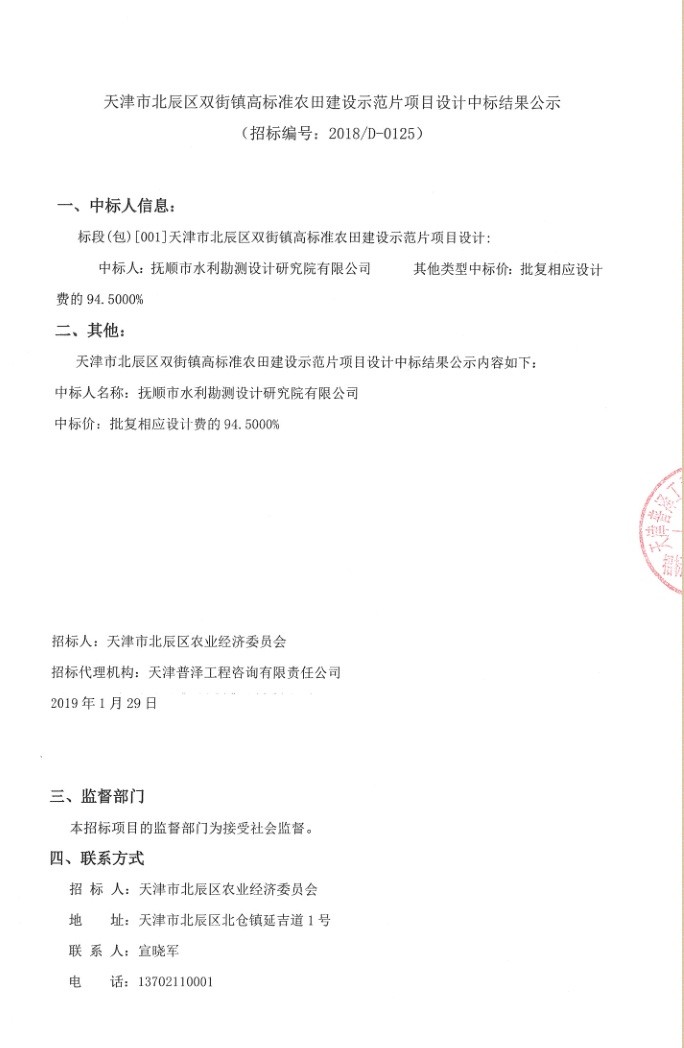 天津市北辰区双街镇高标准农田建设示范片项目设计中标结果公示