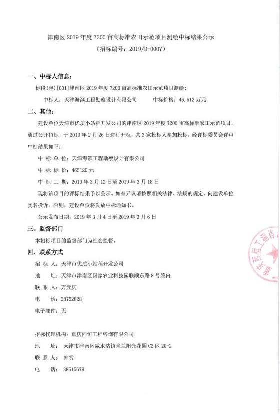 津南区2019年度7200亩高标准农田示范项目测绘中标结果公示