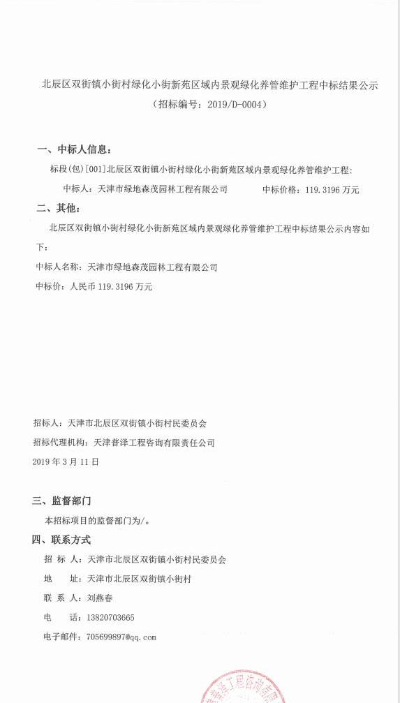 北辰区双街镇小街村绿化小街新苑区域内景观绿化养管维护工程中标结果公示