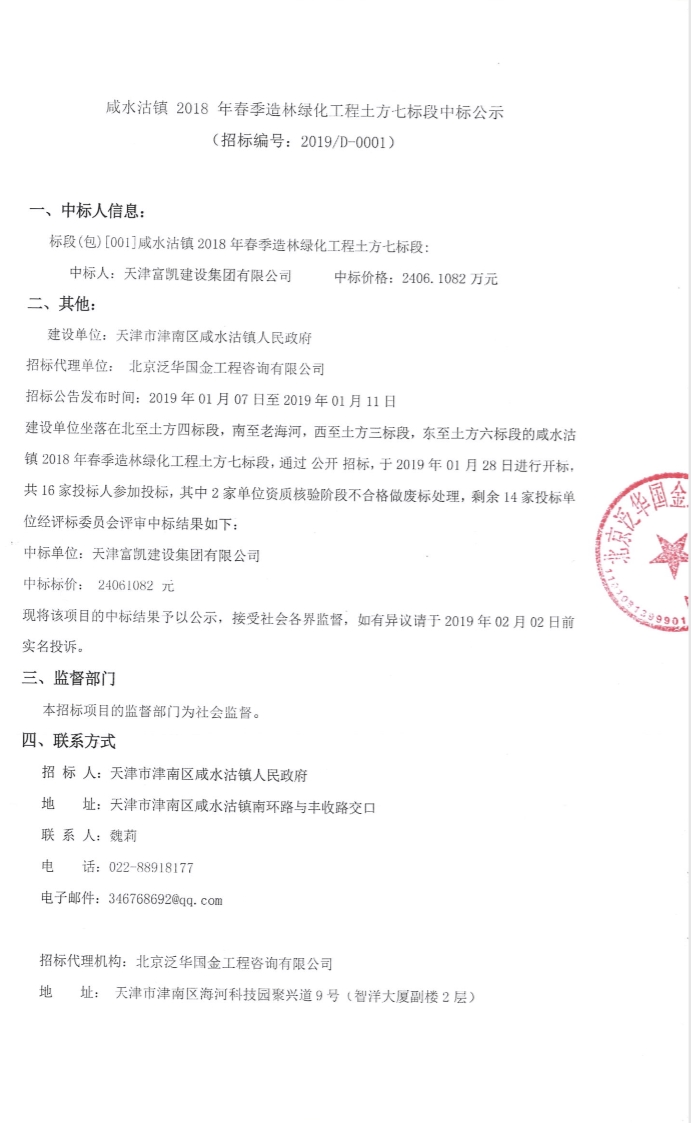咸水沽镇 2018 年春季造林绿化工程土方七标段中标公示