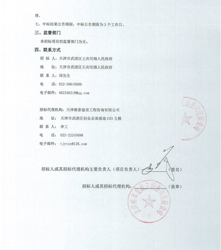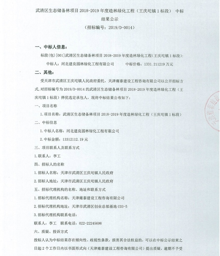 武清区生态储备林项目2018-2019年度造林绿化工程(王庆坨镇1标段) 中标结果公示