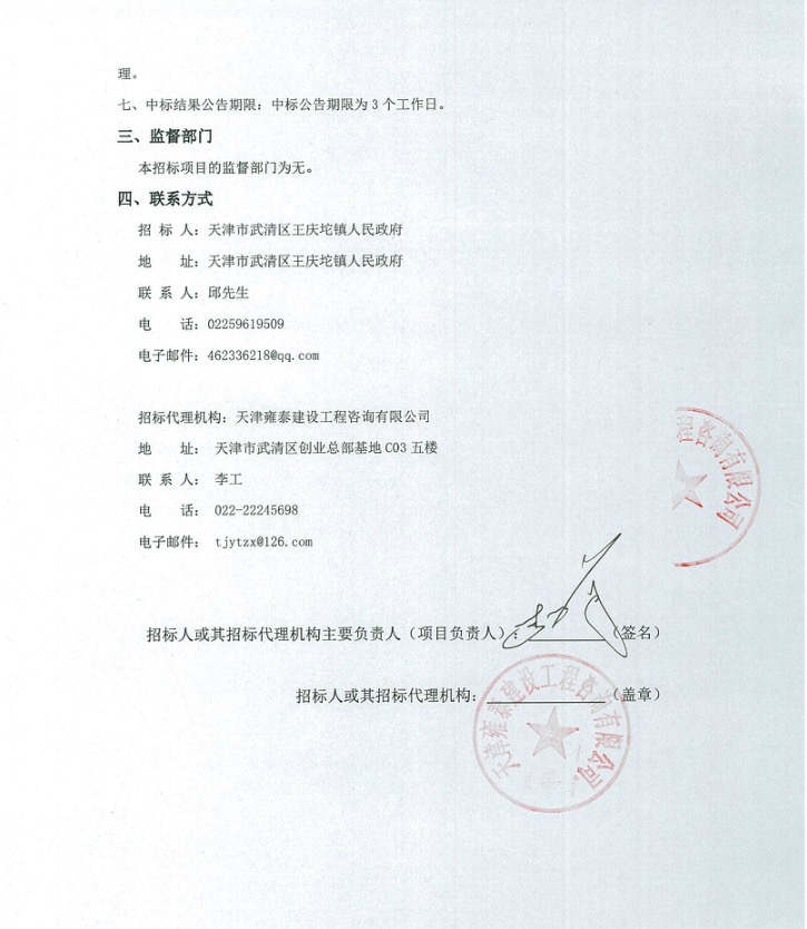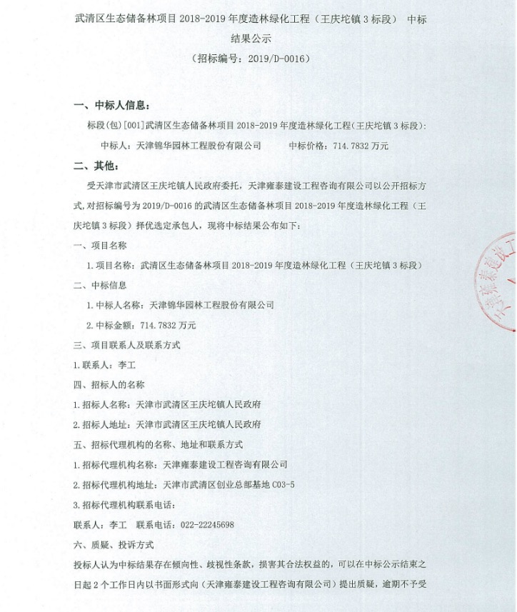 武清区生态储备林项目2018-2019年度造林绿化工程(王庆坨镇3标段) 中标结果公示