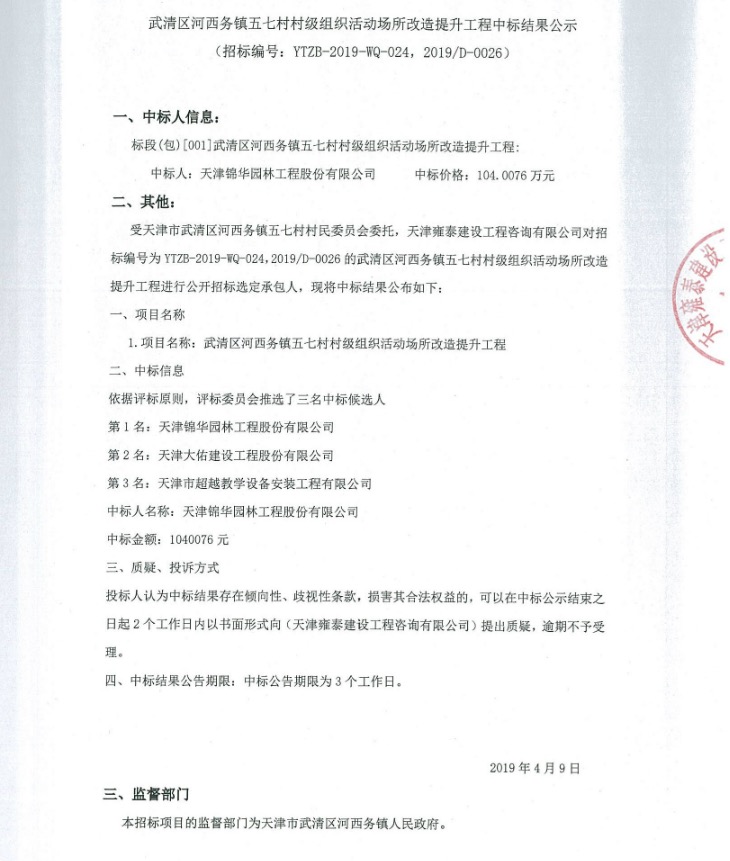 武清区河西务镇五七村村级组织活动场所改造提升工程中标结果公示
