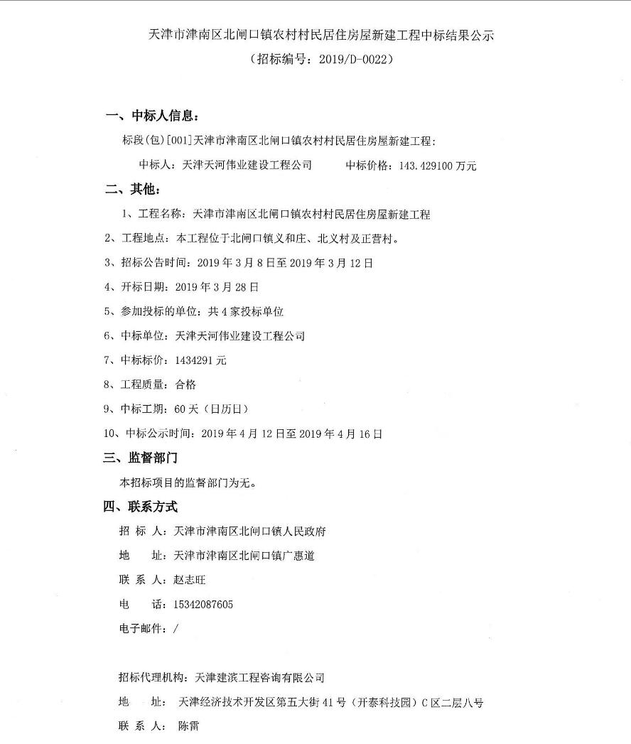 天津市津南区北闸口镇农村村民居住房屋新建工程中标结果公示