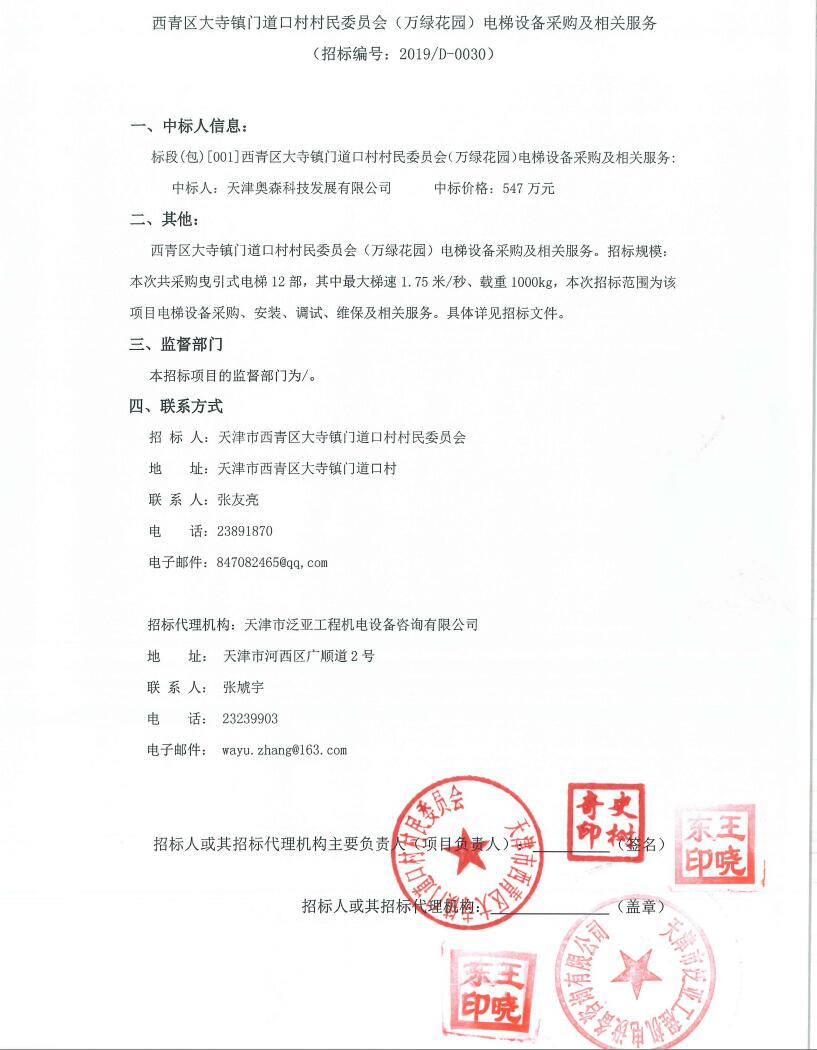 西青区大寺镇门道口村村民委员会(万绿花园)电梯设备采购及相关服务