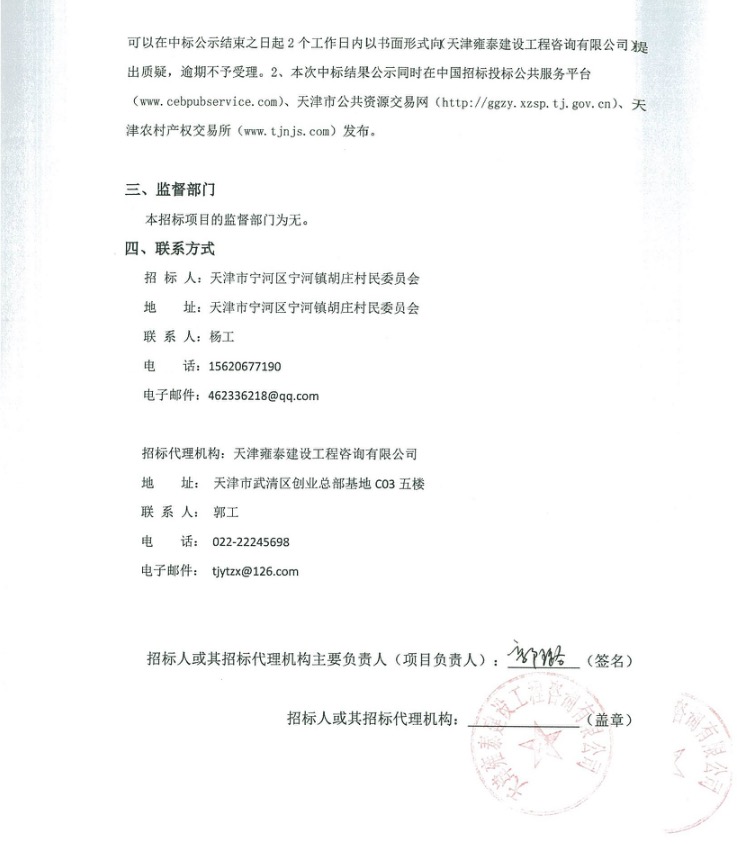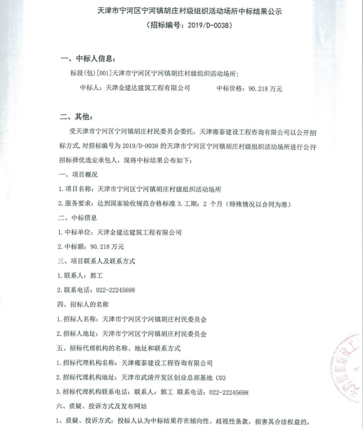 天津市宁河区宁河镇胡庄村级组织活动场所中标结果公示