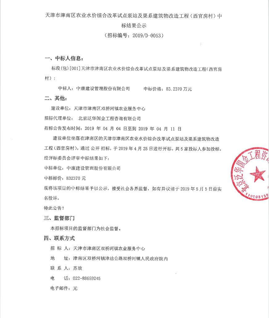 天津市津南区农业水价综合改革试点泵站及渠系建筑物改造工程(西官房村)中标结果公示