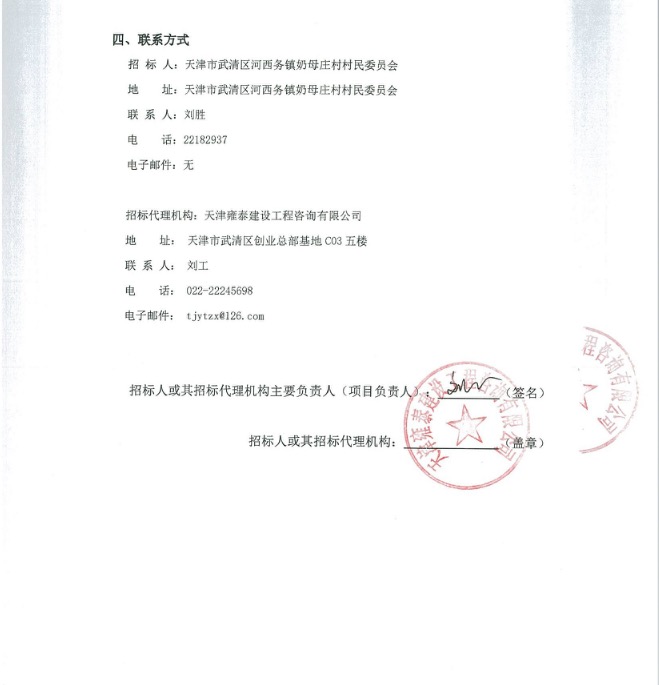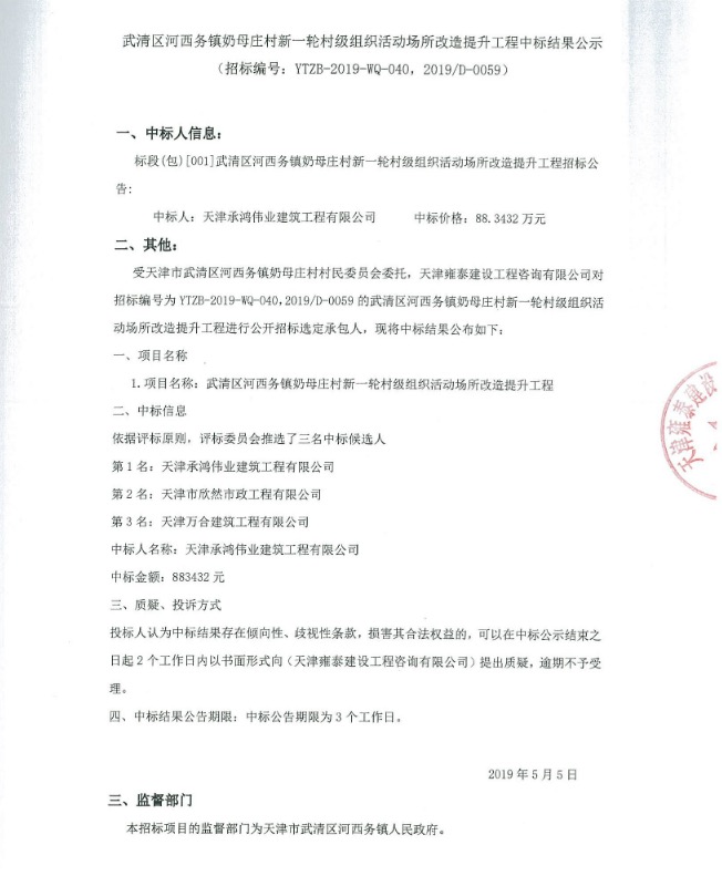 武清区河西务镇奶母庄村新一轮村级组织活动场所改造提升工程中标结果公示