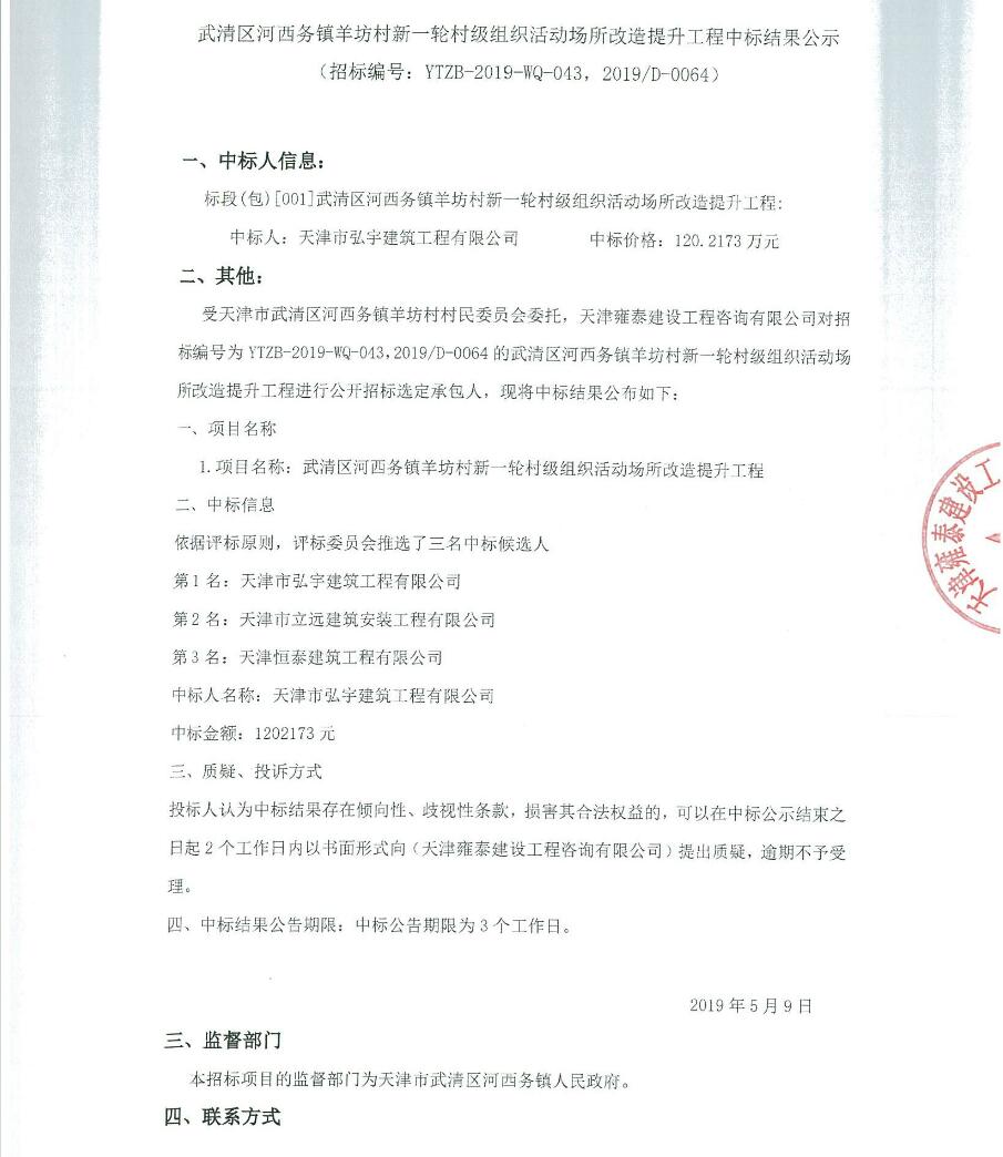 武清区河西务镇羊坊村新一轮村级组织活动场所改造提升工程中标结果公示