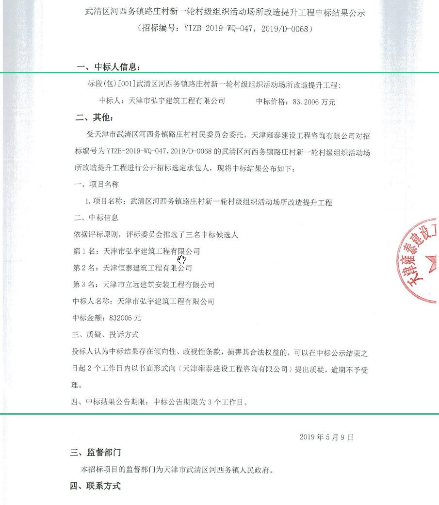 武清区河西务镇路庄村新一轮村级组织活动场所改造提升工程中标结果公示