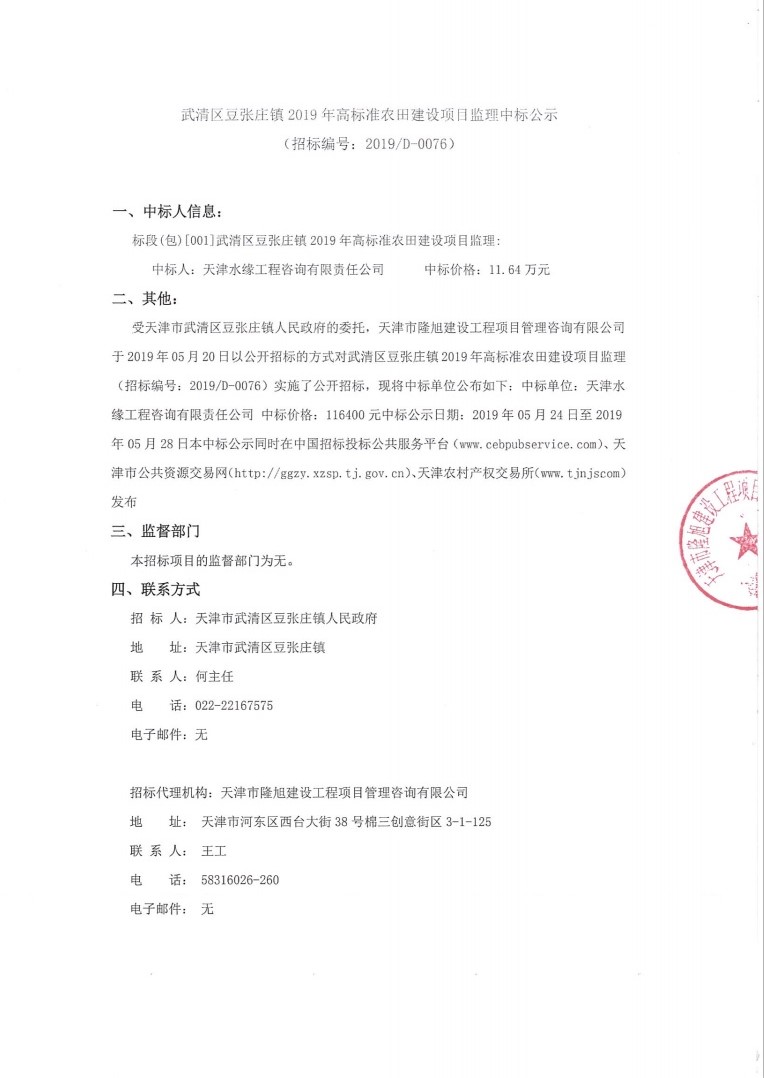武清区豆张庄镇2019年高标准农田建设项目监理中标公示