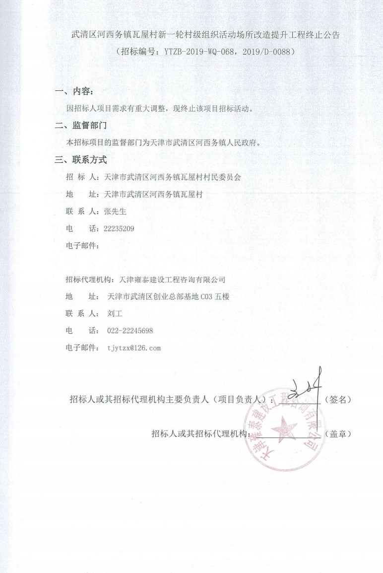 武清区河西务镇瓦屋村新一轮村级组织活动场所改造提升工程终止公告