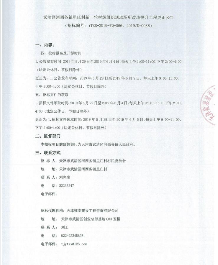 武清区河西务镇里庄村新一轮村级组织活动场所改造提升工程更正公告