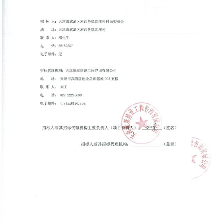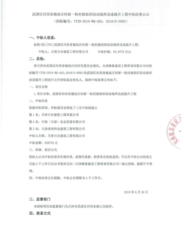 武清区河西务镇高庄村新一轮村级组织活动场所改造提升工程中标结果公示