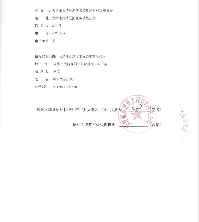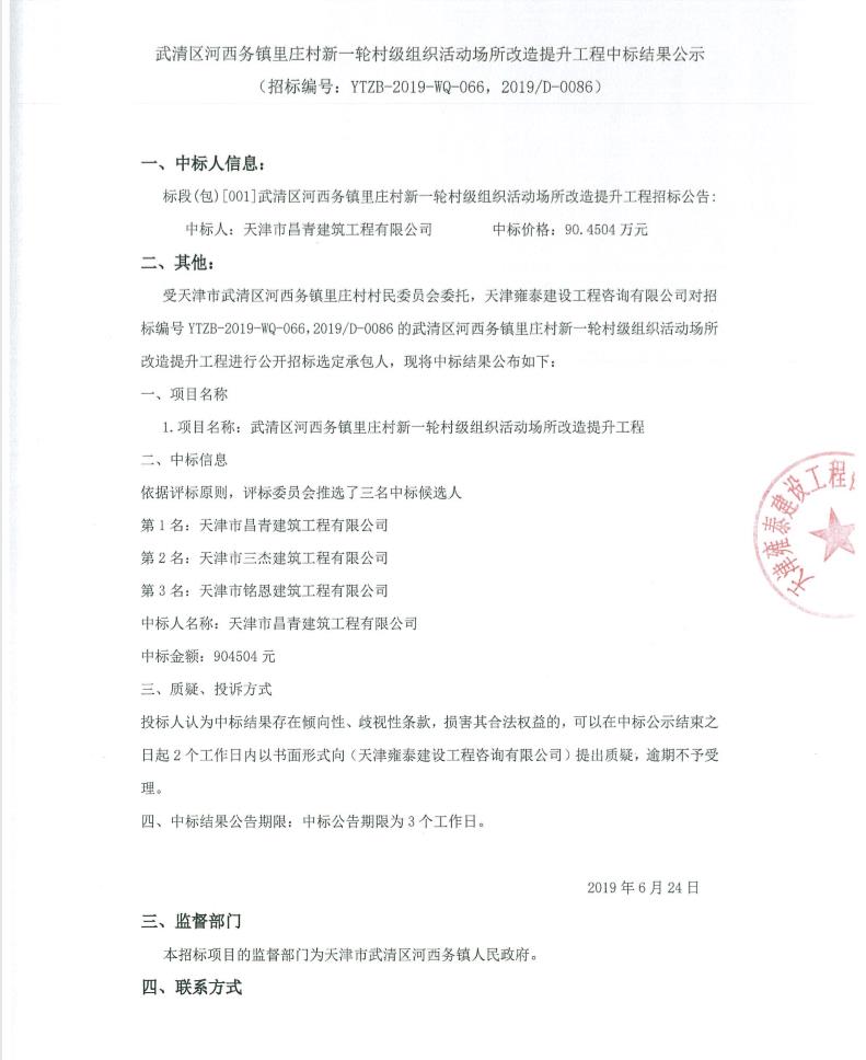 武清区河西务镇里庄村新一轮村级组织活动场所改造提升工程中标结果公示
