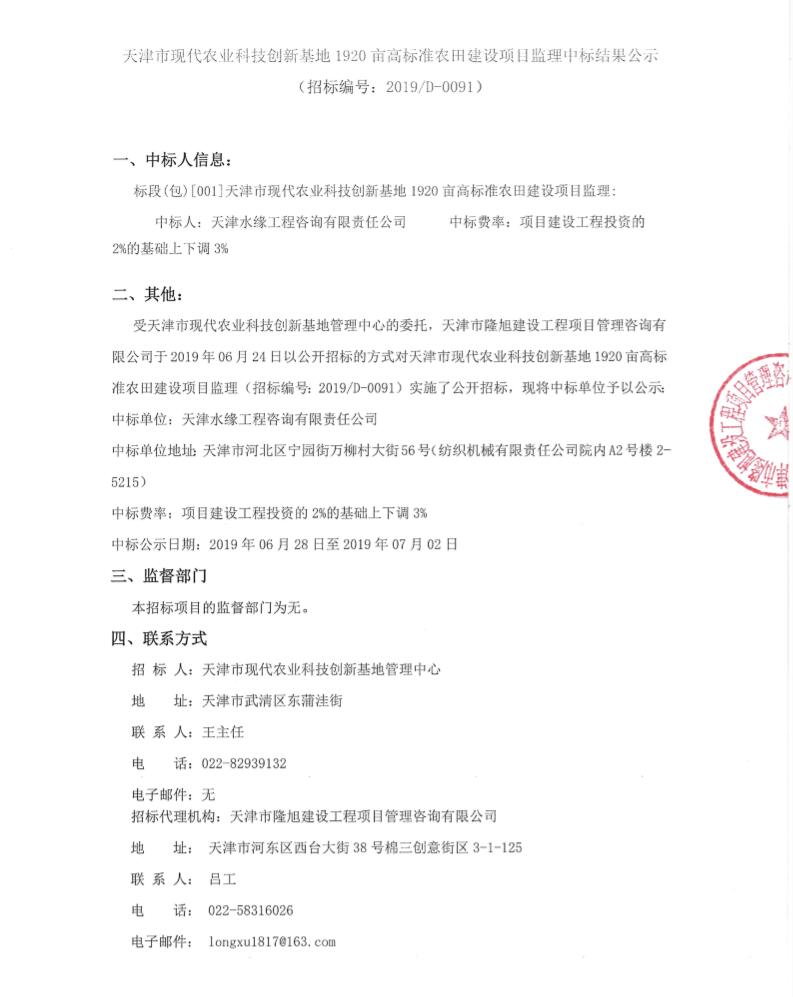 天津市现代农业科技创新基地1920亩高标准农田建设项目监理中标结果公示