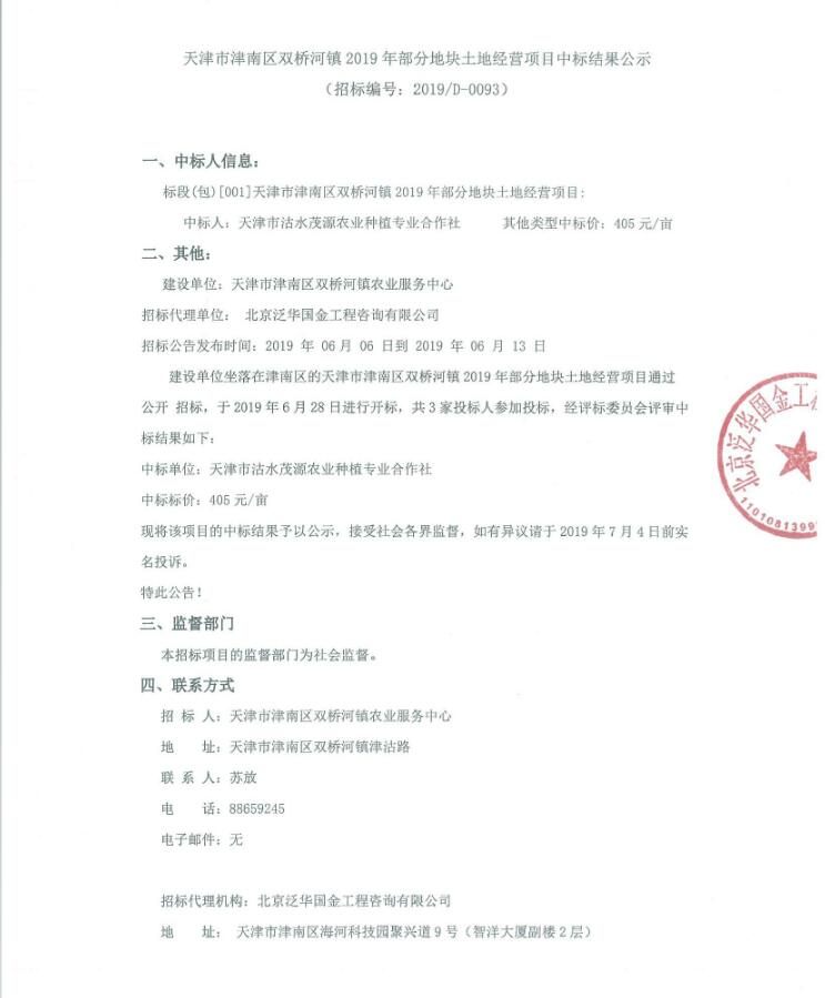 天津市津南区双桥河镇2019年部分地块土地经营项目中标结果公示
