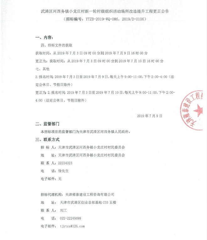 武清区河西务镇小龙庄村新一轮村级组织活动场所改造提升工程更正公告