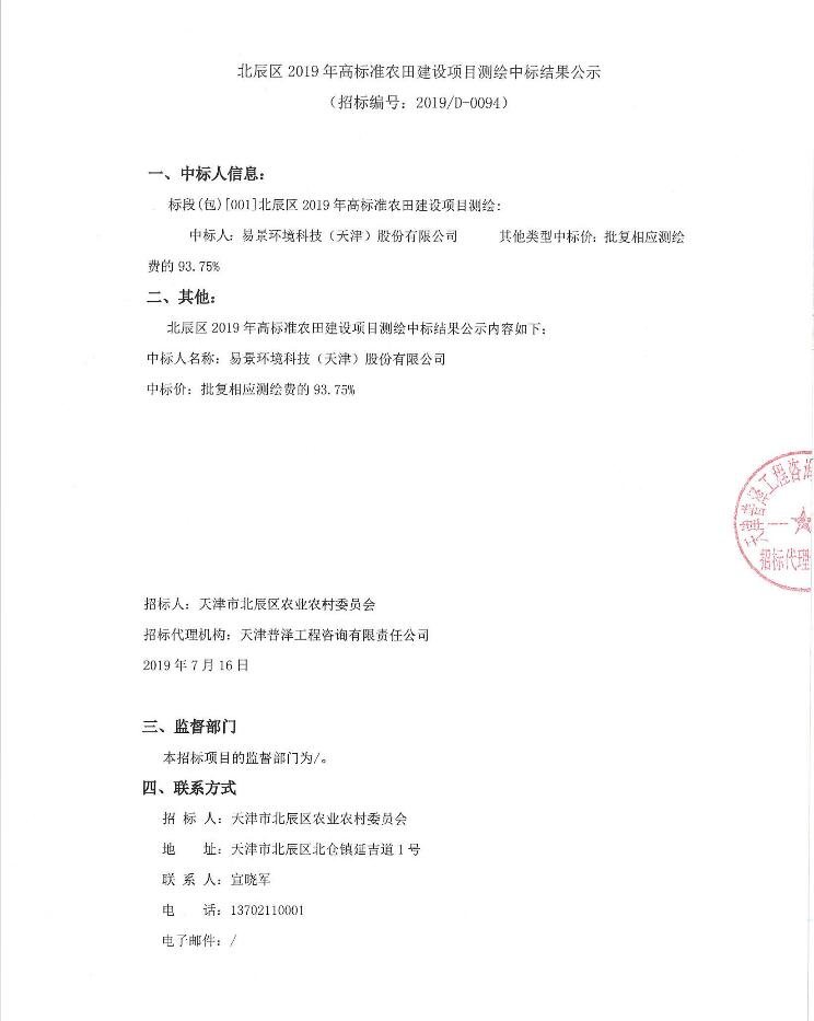 北辰区2019年高标准农田建设项目测绘中标结果公示