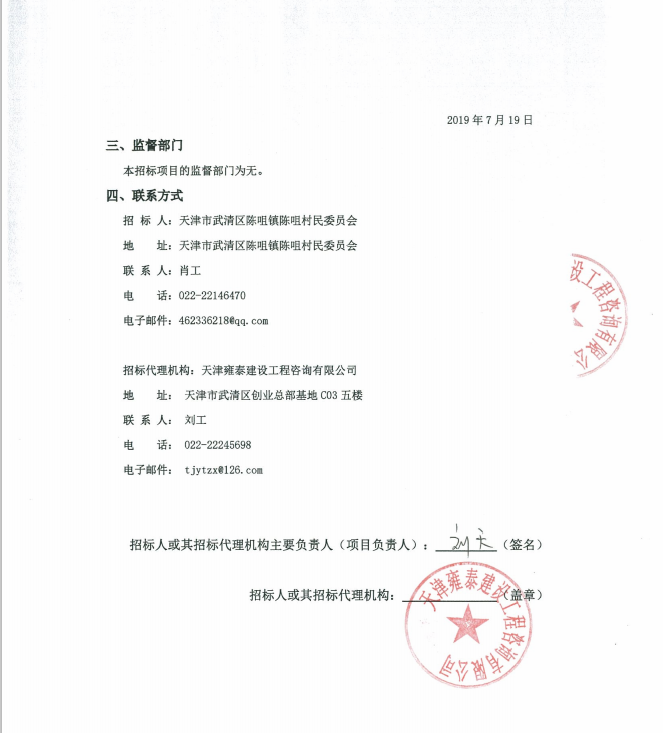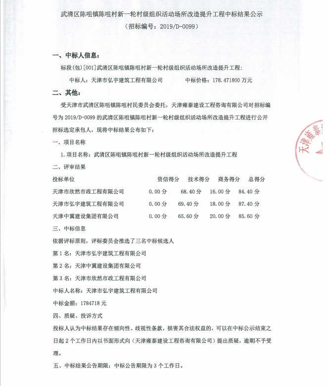 武清区陈咀镇陈咀村新一轮村级组织活动场所改造提升工程中标结果公示