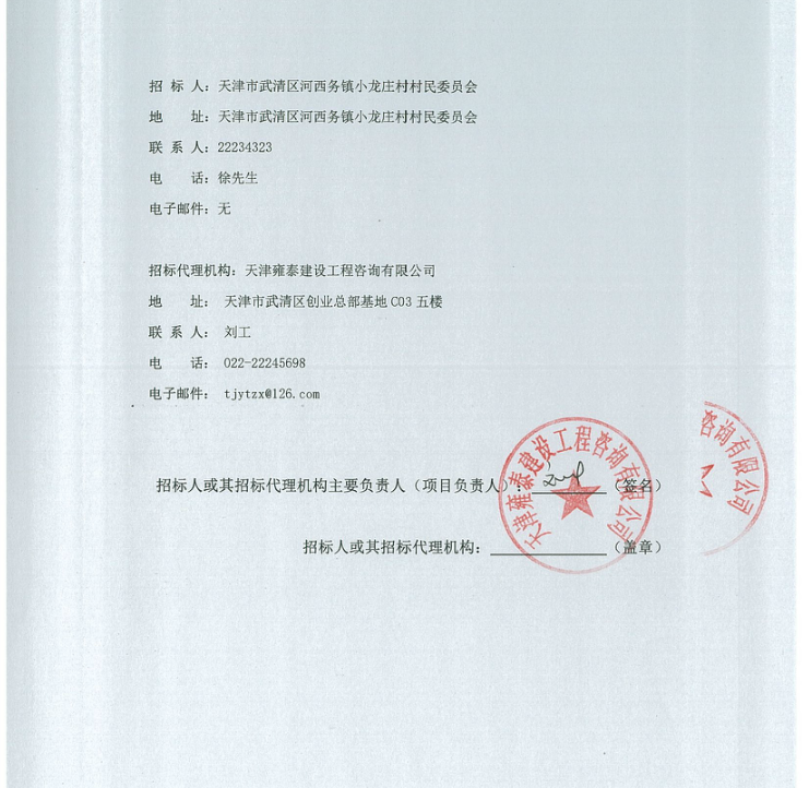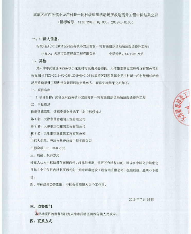武清区河西务镇小龙庄村新一轮村级组织活动场所改造提升工程中标结果公示