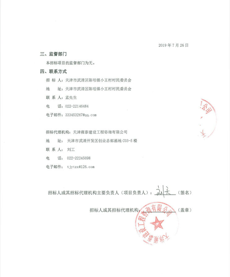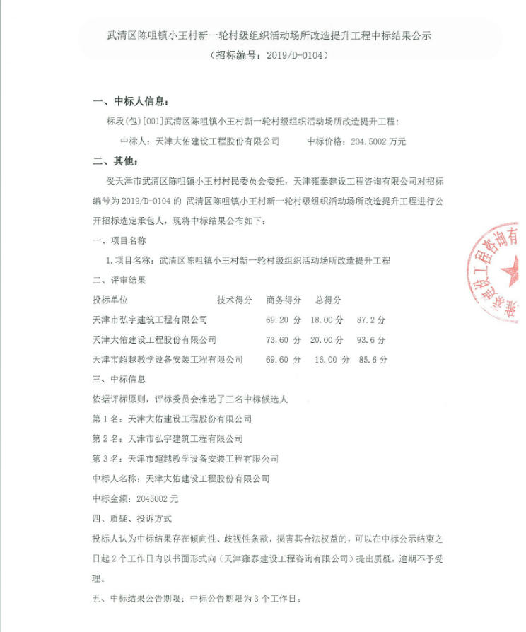 武清区陈咀镇小王村新一轮村级组织活动场所改造提升工程中标结果公示