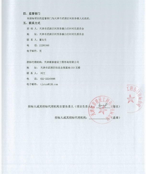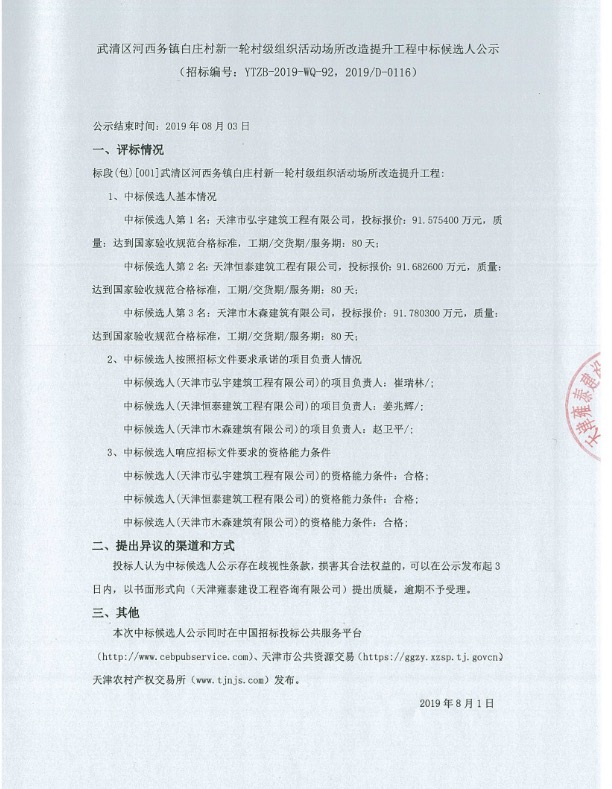 武清区河西务镇白庄村新一轮村级组织活动场所改造提升工程中标候选人公示