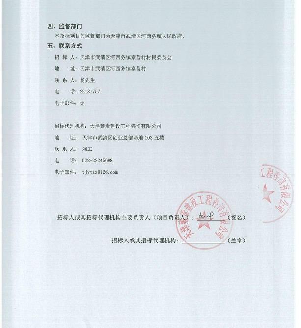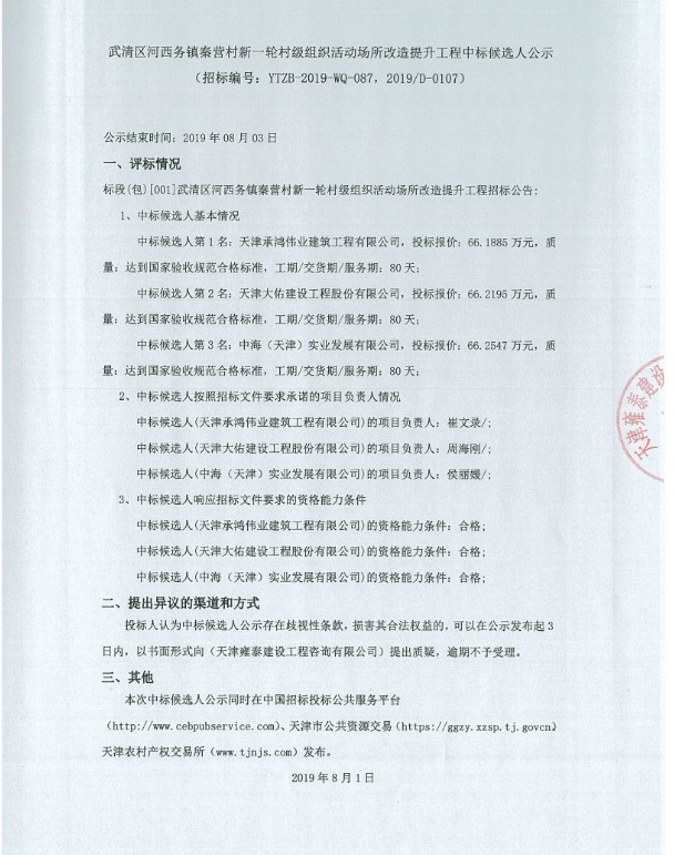 武清区河西务镇秦营村新一轮村级组织活动场所改造提升工程中标候选人公示