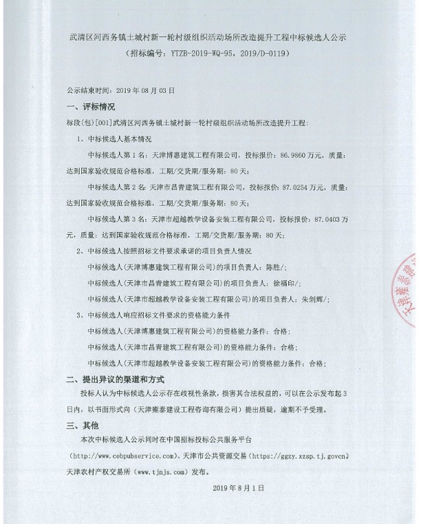 武清区河西务镇土城村新一轮村级组织活动场所改造提升工程中标候选人公示