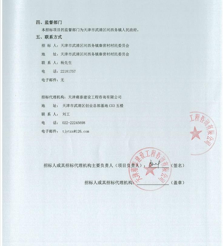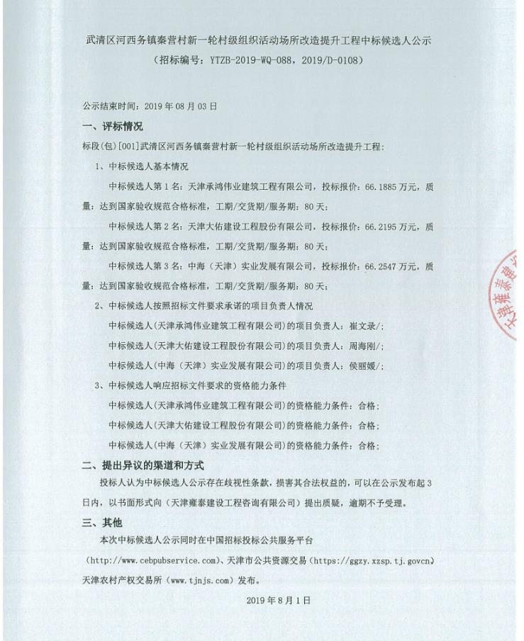 武清区河西务镇秦营村新一轮村级组织活动场所改造提升工程中标候选人公示