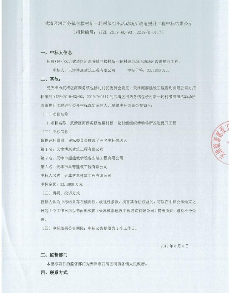 武清区河西务镇包楼村新一轮村级组织活动场所改造提升工程中标结果公示