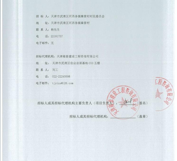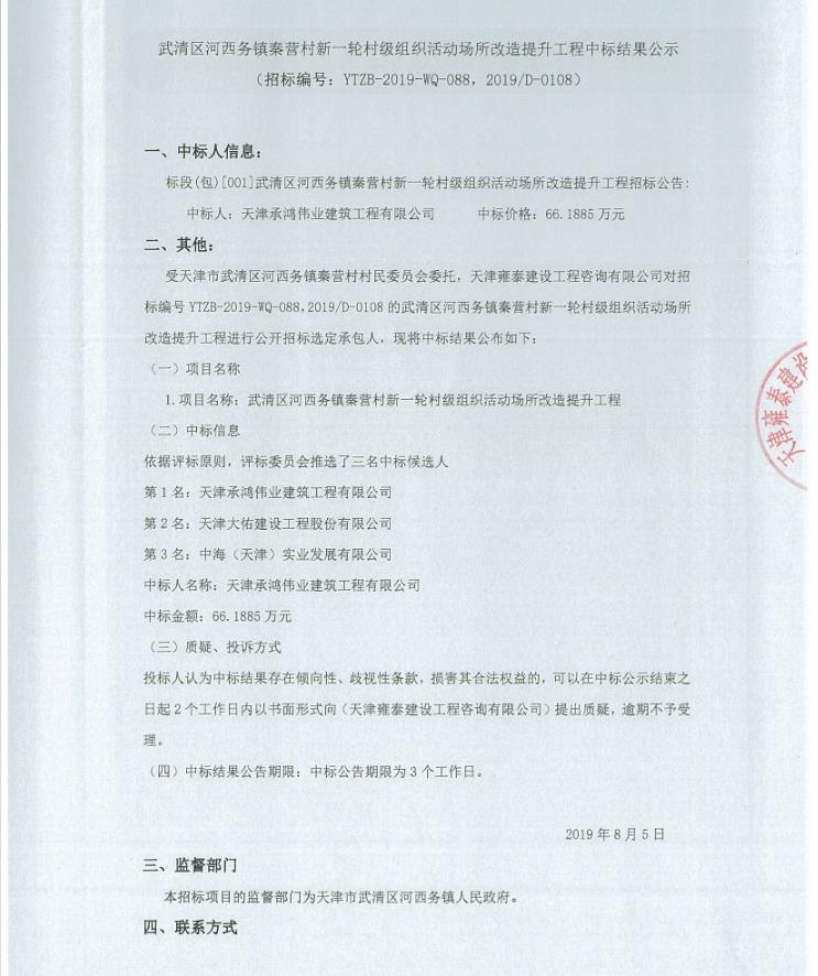 武清区河西务镇秦营村新一轮村级组织活动场所改造提升工程中标结果公示