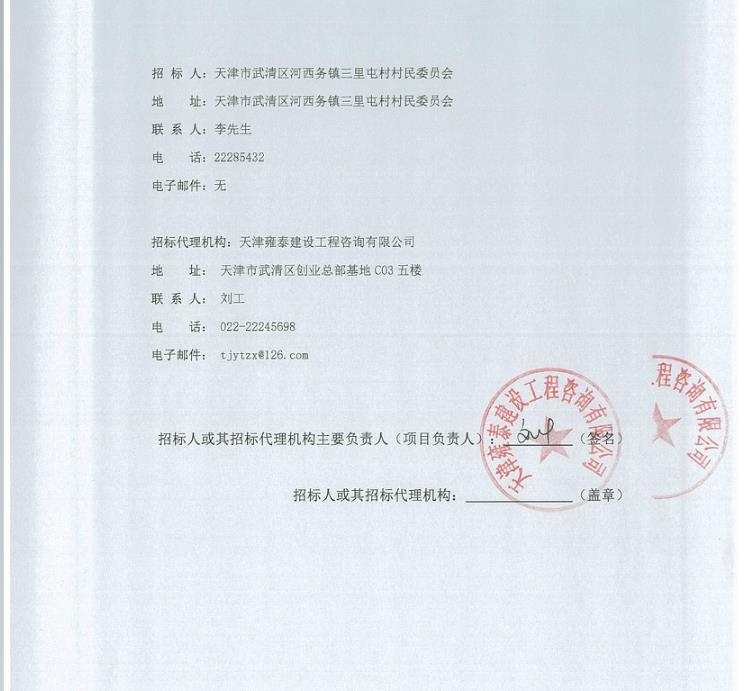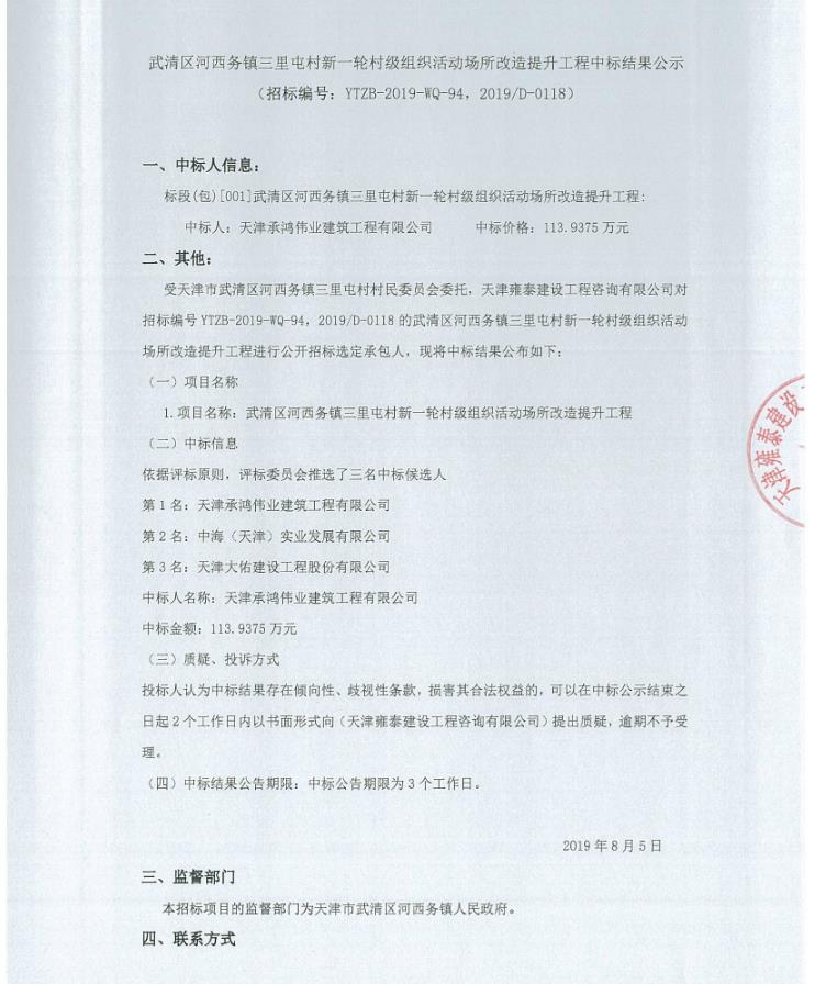 武清区河西务镇三里屯村新一轮村级组织活动场所改造提升工程中标结果公示
