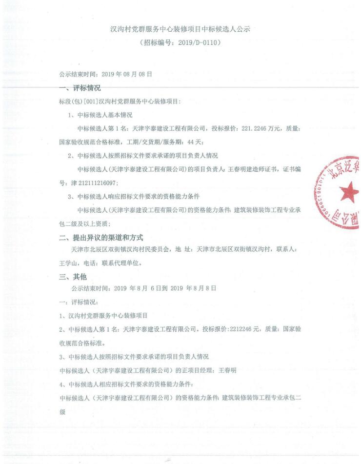 汉沟村党群服务中心装修项目中标候选人公示